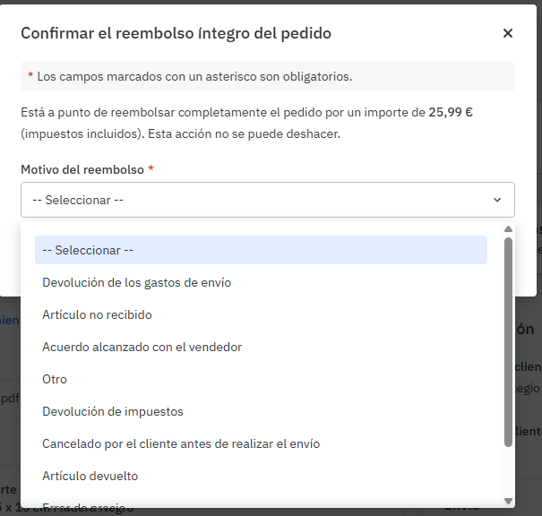 Si seleccionáis Reembolso completo, simplemente elegid el motivo del abono y confirmad. El pedido pasará automáticamente al estado “Cerrado” y, en pocos días, el cliente recibirá el importe total del pedido.