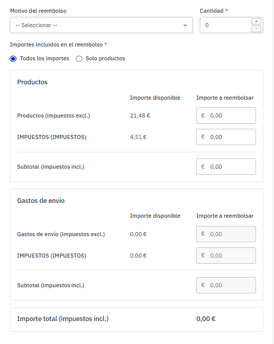 Si seleccionáis “Reembolsar parte del pedido”, el sistema os dirigirá a una nueva página con opciones adicionales para desglosar la devolución. Allí podréis especificar con más detalle qué parte del pedido se debe abonar.